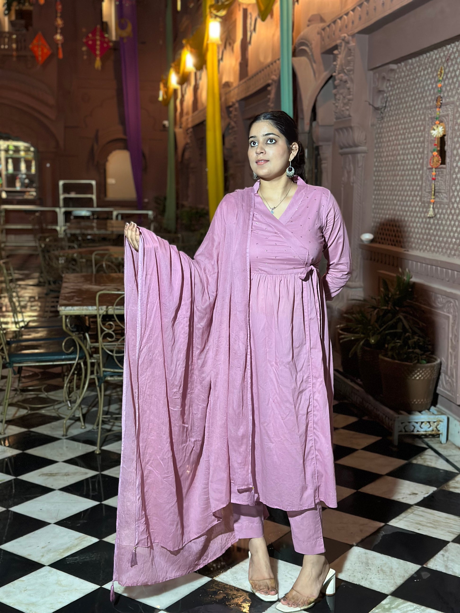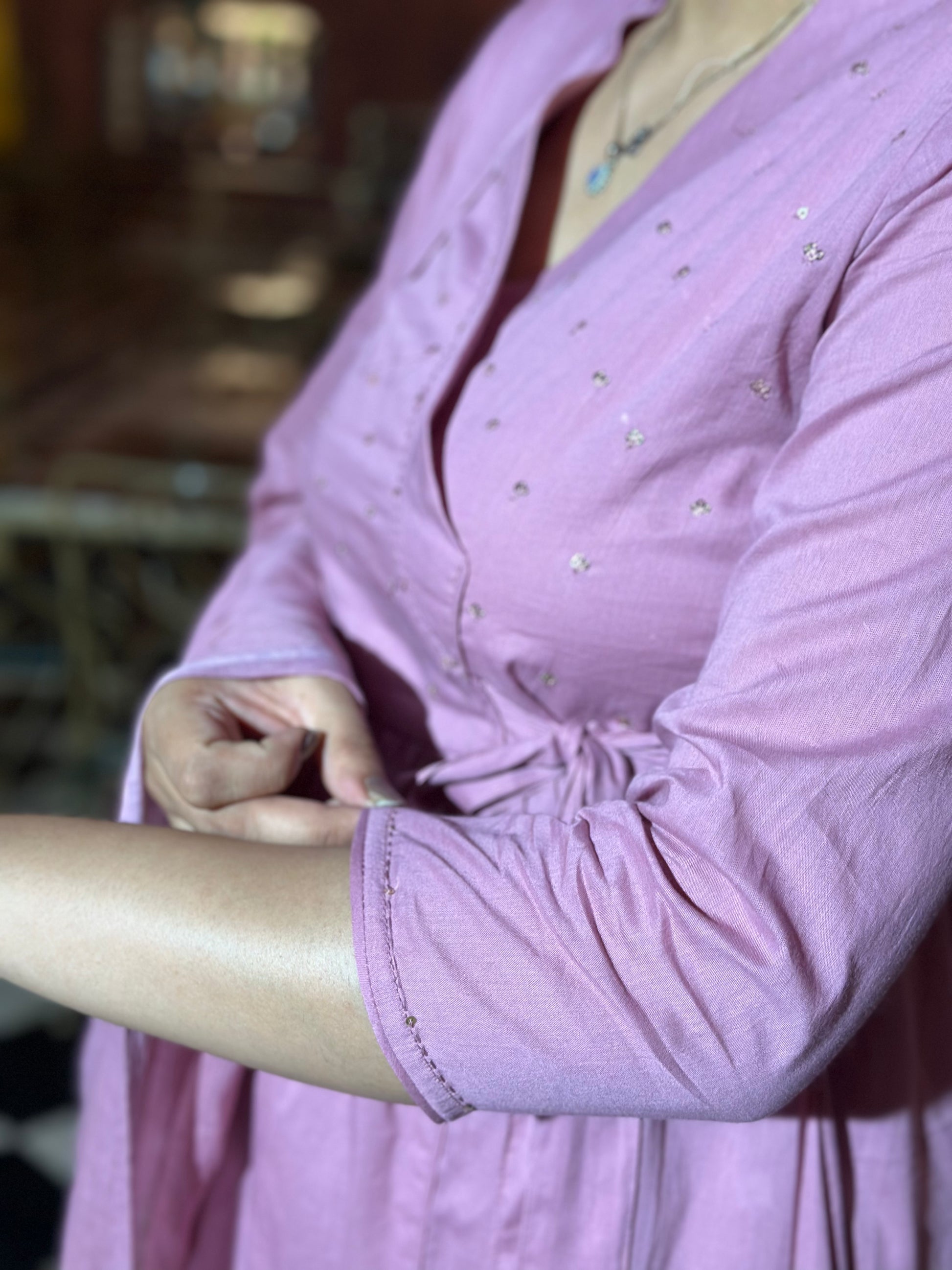 Elevate your ethnic wardrobe with this exquisite Lavender Angrakha Kurta Set, designed for festive elegance and comfort. Crafted from premium pure cotton, this kurta offers a soft, breathable feel, making it ideal for all-day wear.